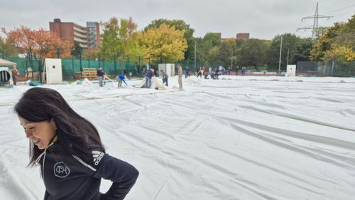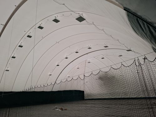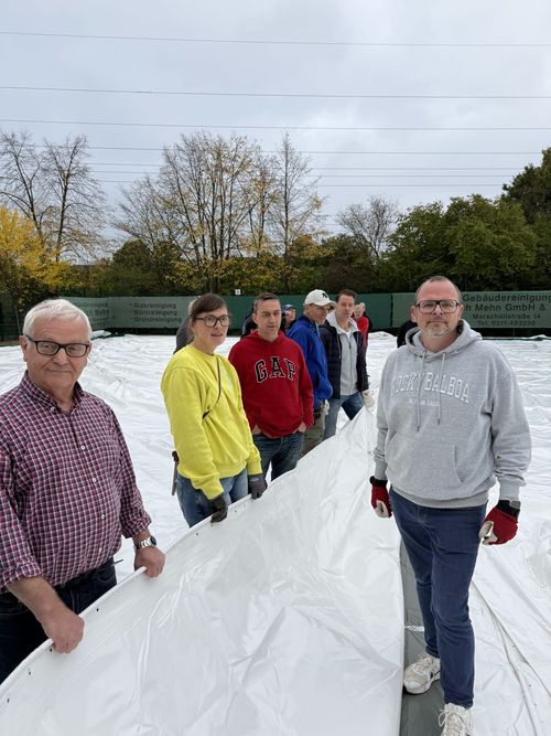 Die Hallenhülle besteht aus 3 Teilen, die mit unzähligen Schrauben miteinander verbunden werden mussten. Jedes Teilstück wiegt ca. 2 Tonnen, so dass alle Helfer beim Ausrollen der Hallenhülle anfassen mussten. Die Seiten der Hallenhülle sind mit ca. 170 Bodenankern, die vor einigen Wochen ca. 1,5 m in den Boden gedrillt wurden, gesichert. Die erforderlichen Versorgungsleitungen für Gas- und Strom wurden bereits im Sommer installiert. Am Montag, den 13.10.2025, wurden die Restarbeiten, wie z.B. die Beleuchtung und die Netze installiert, so dass der Spielbetrieb am Dienstag, den 14.10.2025, starten kann.
